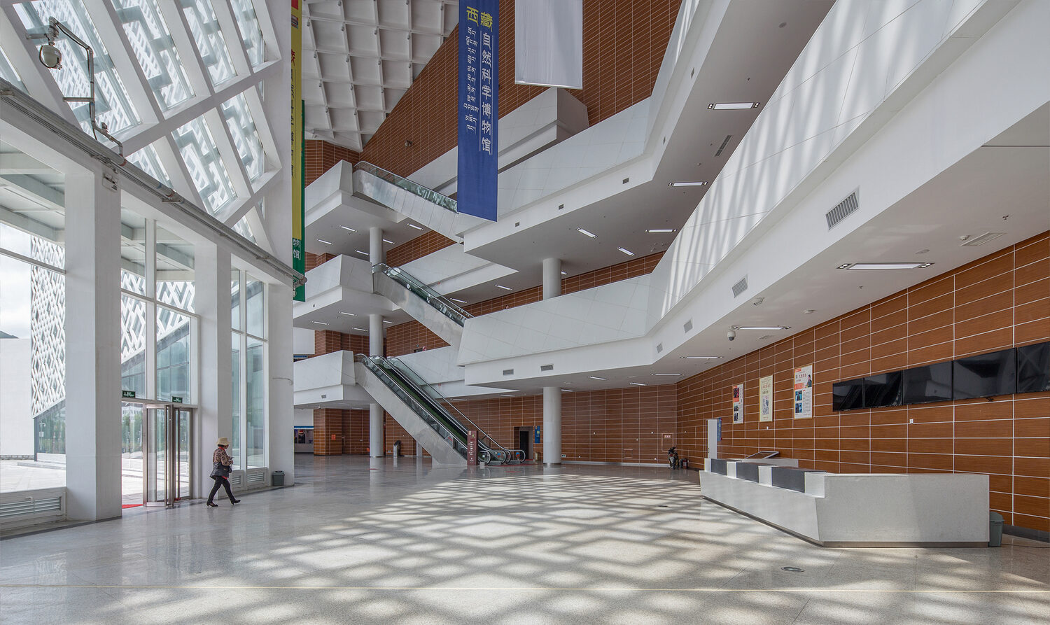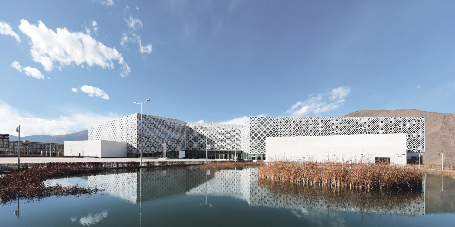 項(xiàng)目設(shè)計(jì)之初,就確定了結(jié)合當(dāng)?shù)丨h(huán)境氣候優(yōu)勢(shì),以表皮遮陽(yáng)、太陽(yáng)能和地源熱泵潔凈能源體系利用等措施,同時(shí)達(dá)到中國(guó)《綠色建筑評(píng)價(jià)標(biāo)準(zhǔn)》和英國(guó)BREEAM評(píng)價(jià)標(biāo)準(zhǔn),外立面剪空裝飾外皮的設(shè)計(jì)靈感配合了高原地區(qū)遮陽(yáng)要求,室內(nèi)中庭內(nèi)投下的靈動(dòng)光影,帶給公眾無(wú)盡的想象力,抽象詮釋了藏文化中曼陀羅和吉祥結(jié)之間的演變。