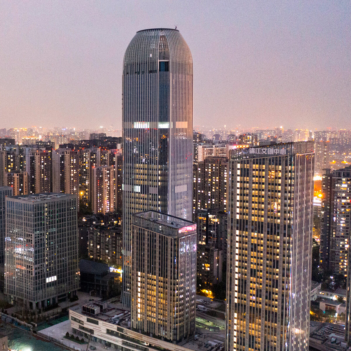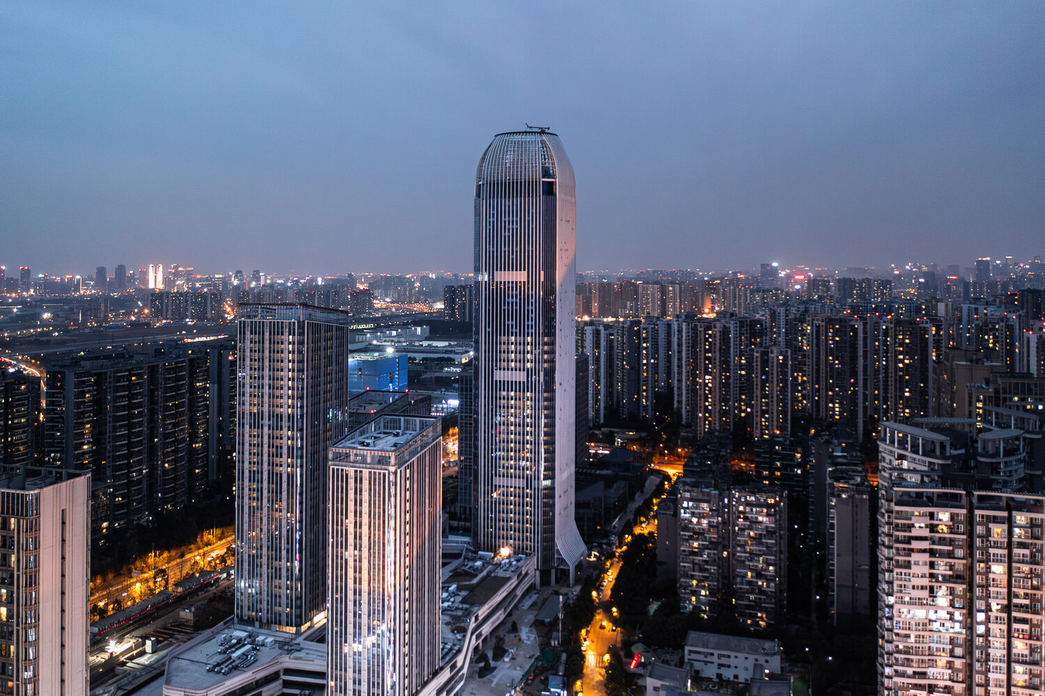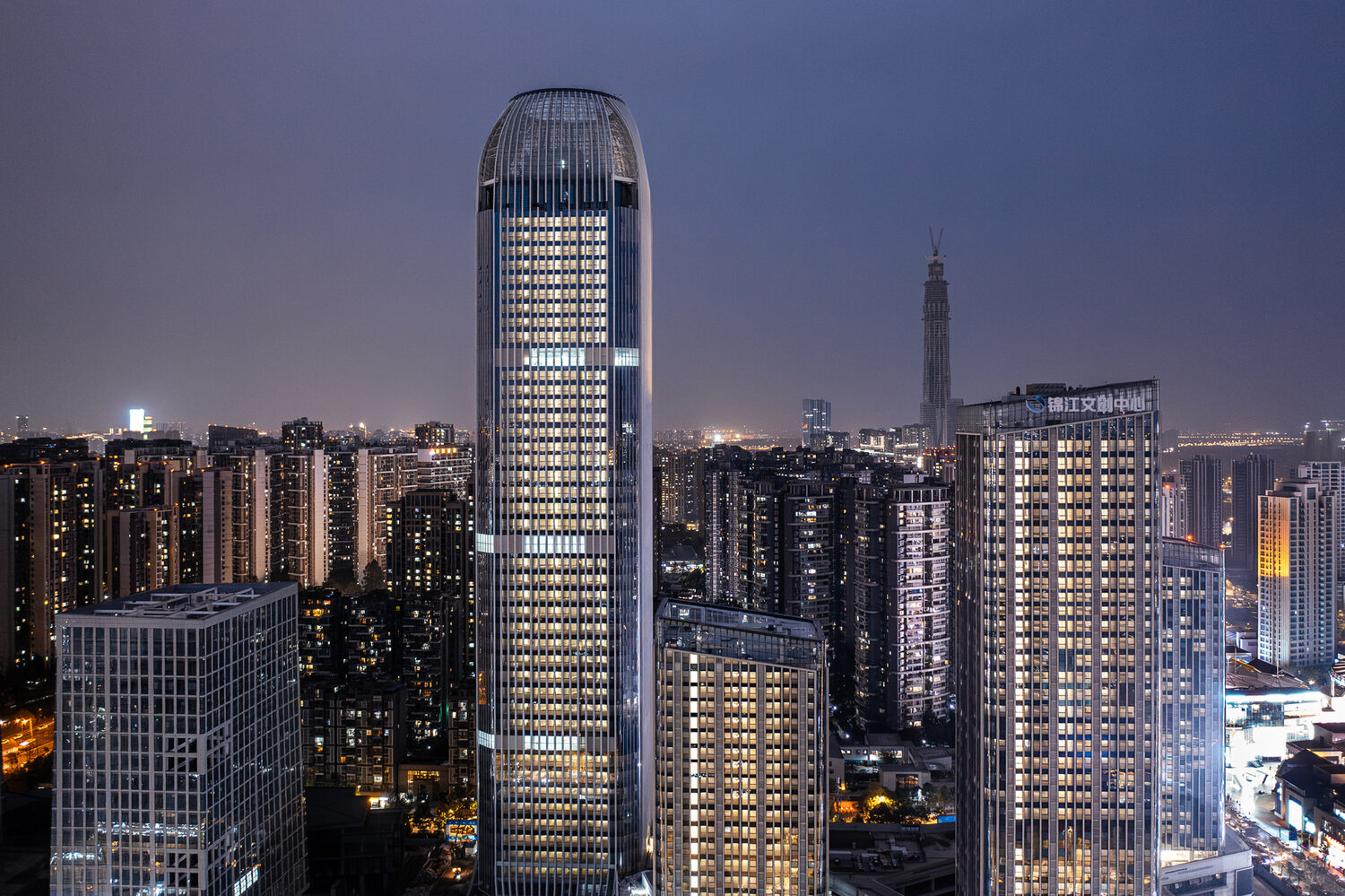 項目建設(shè)用地位于成都市三環(huán)外東南方,驛都大道與成龍大道之間的東部發(fā)展片區(qū)——成都重要的旅游休閑地塊三圣鄉(xiāng)片區(qū),隸屬于成都市錦江區(qū),用地性質(zhì)為商業(yè)服務(wù)業(yè)設(shè)施用地。項目用地位于錦江區(qū)東洪路以東、梔子街以南、喜樹街以西、成龍大道以北。場址地理位置優(yōu)越,交通便利,水、電、路、通訊等配套基礎(chǔ)設(shè)施較為齊全,建設(shè)條件齊備。項目包括超高層辦公和多層街區(qū),總建筑面積237,900平方米,其中地上184,192平方米,兩層地下室,超高層塔樓共計60層,建筑高度258.25米,多層街區(qū)包含媒體中心、展示中心和體驗中心等,共計4層,建筑高度20.65米。項目各個功能區(qū)通過立體連廊相互聯(lián)系,有效對接。