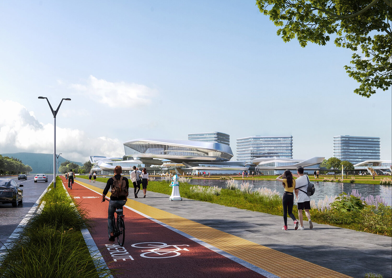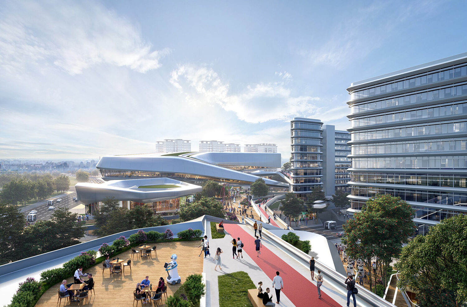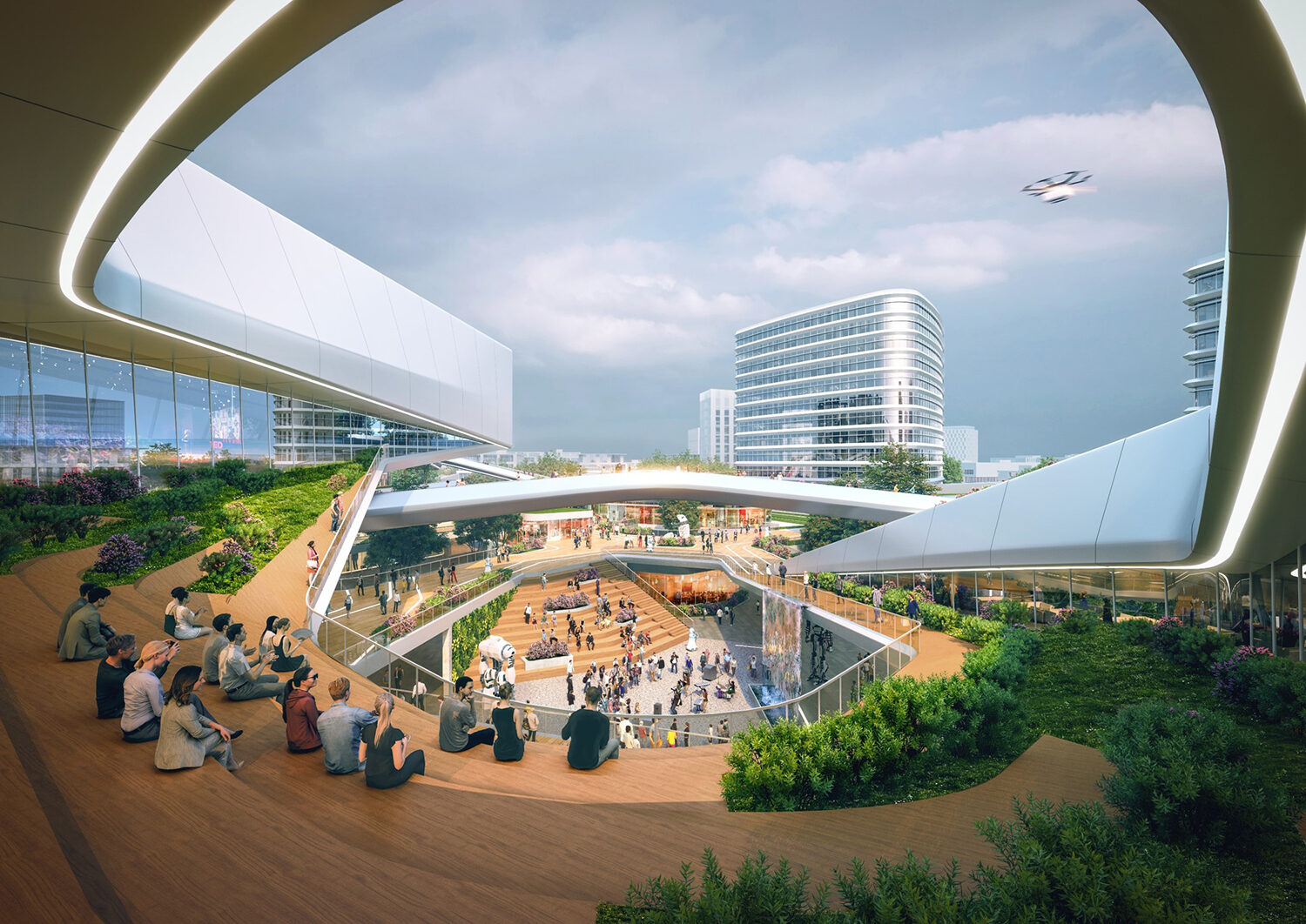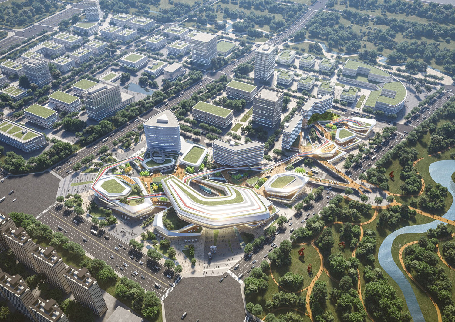 項(xiàng)目位于規(guī)劃中的成都雙流楊柳湖公園城市示范區(qū),距離成都雙流國際機(jī)場約為5.7千米,距市中心約19.5千米。根據(jù)創(chuàng)新空間的需求,將建筑空間切割分解為若干靈活空間,從而獲得更多商業(yè)展示面和更加自由的空間形態(tài)。通過二層連橋及平臺(tái),將分散的商業(yè)服務(wù)空間鏈接起來,為各類人群提供靈活的公共交流空間。開放的公共空間、豐富的創(chuàng)意空間及合理的動(dòng)線組織組成了智慧生活圈,將吸引更多人群,實(shí)現(xiàn)資源的共享。