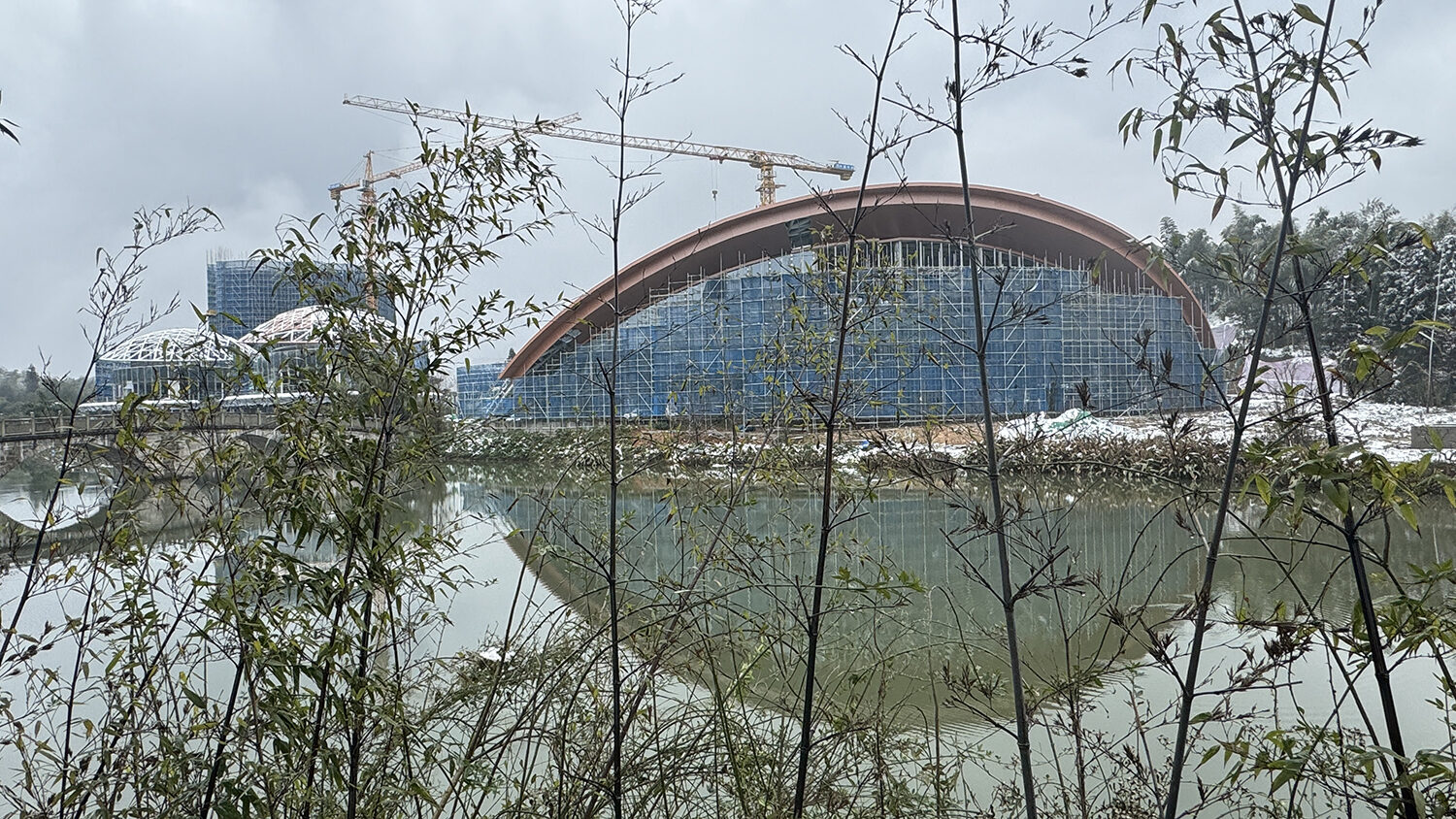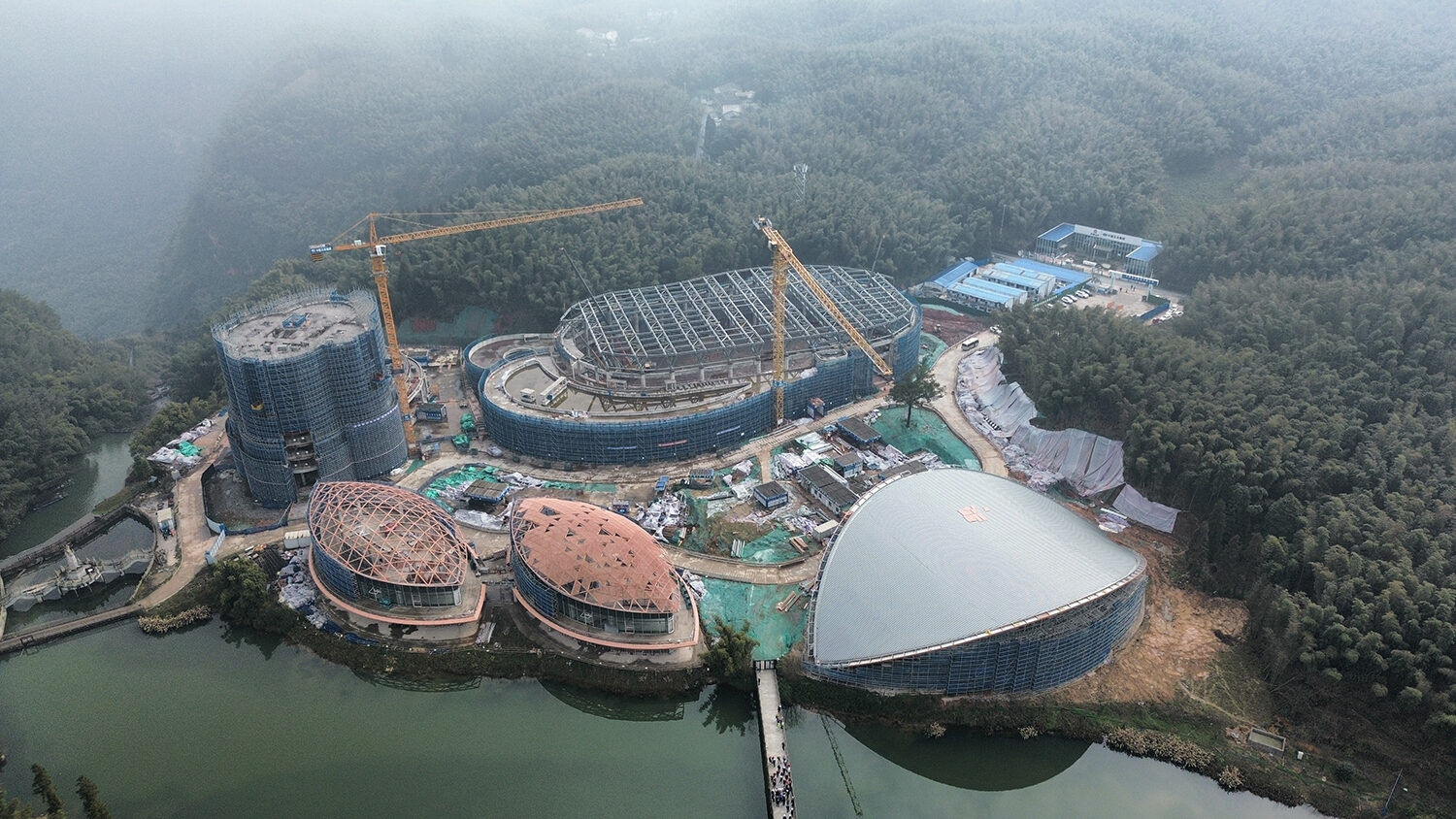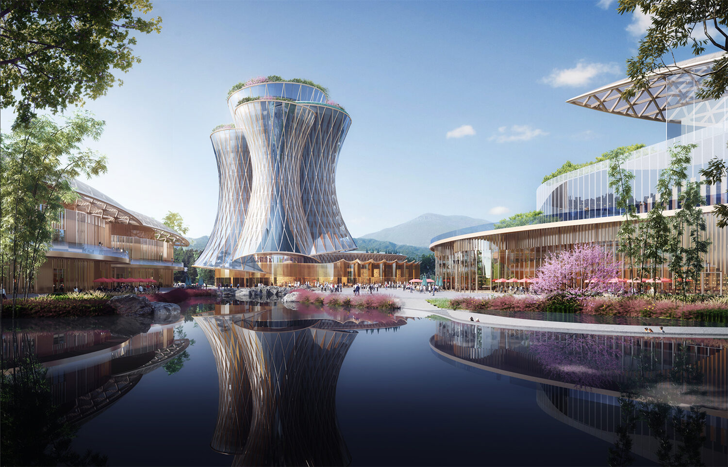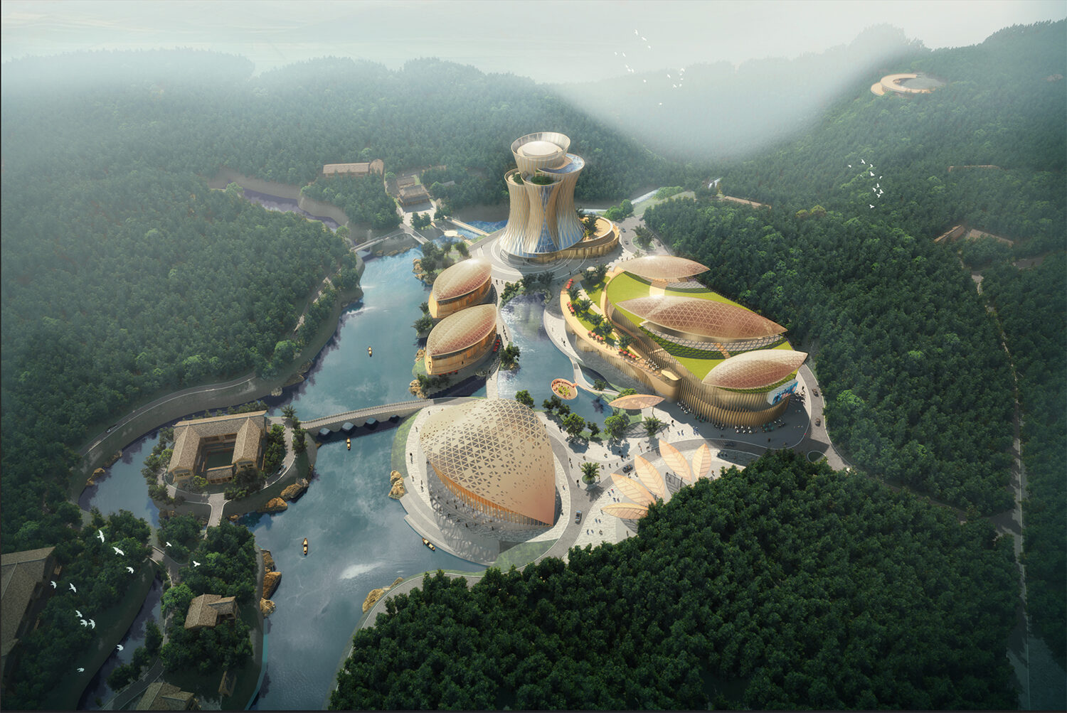 項(xiàng)目主要包括花溪竹舞大地藝術(shù)走廊、風(fēng)林谷飛龍山莊、桐子坳竹藝村境、熊貓?jiān)分袢獔@、七彩絲竹小鎮(zhèn)文化中心、七彩廣場(chǎng)竹酒演藝市集、君悅奢野竹林別苑、集賢科創(chuàng)綠谷等八個(gè)部分。Cendes主要設(shè)計(jì)的是七彩廣場(chǎng)竹酒演藝市集、君悅奢野竹林別苑和集賢科創(chuàng)綠谷三個(gè)部分。
