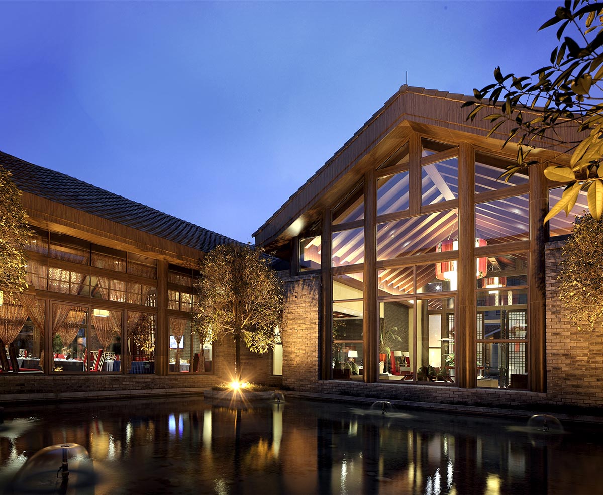 建筑布局和形態(tài)塑造借鑒四川當?shù)亟ㄖ木?,充分體現(xiàn)新津的文脈特征和風(fēng)土人情為當?shù)刎Q立高標準的豪華酒店建筑標桿,成為當?shù)刂匾某鞘信涮坠?jié)點。