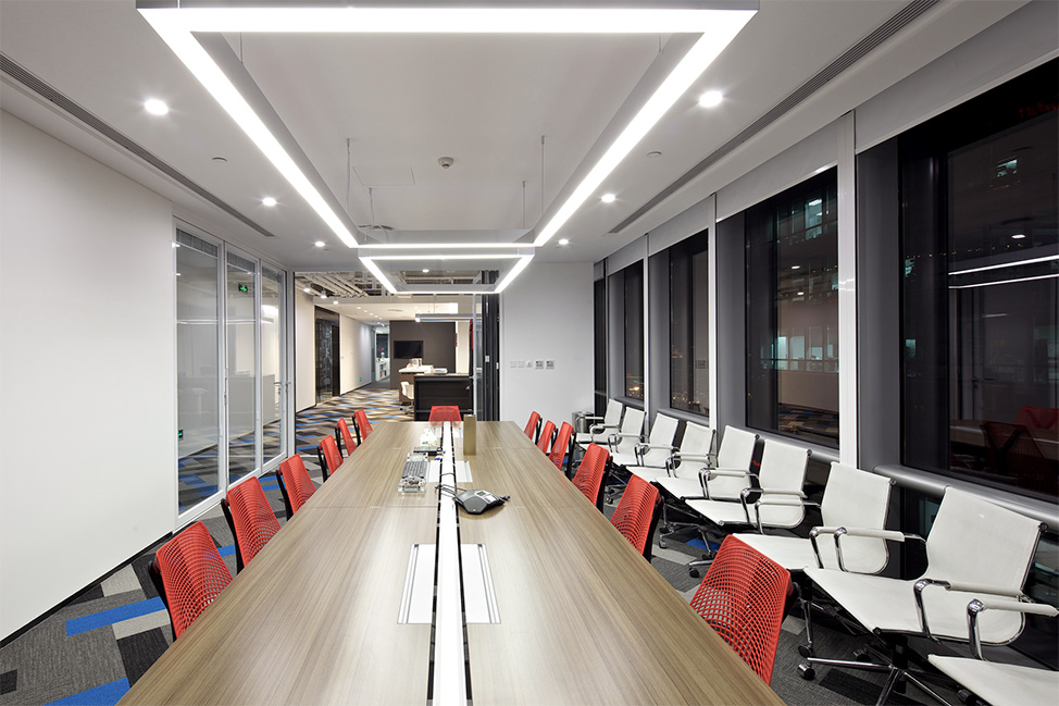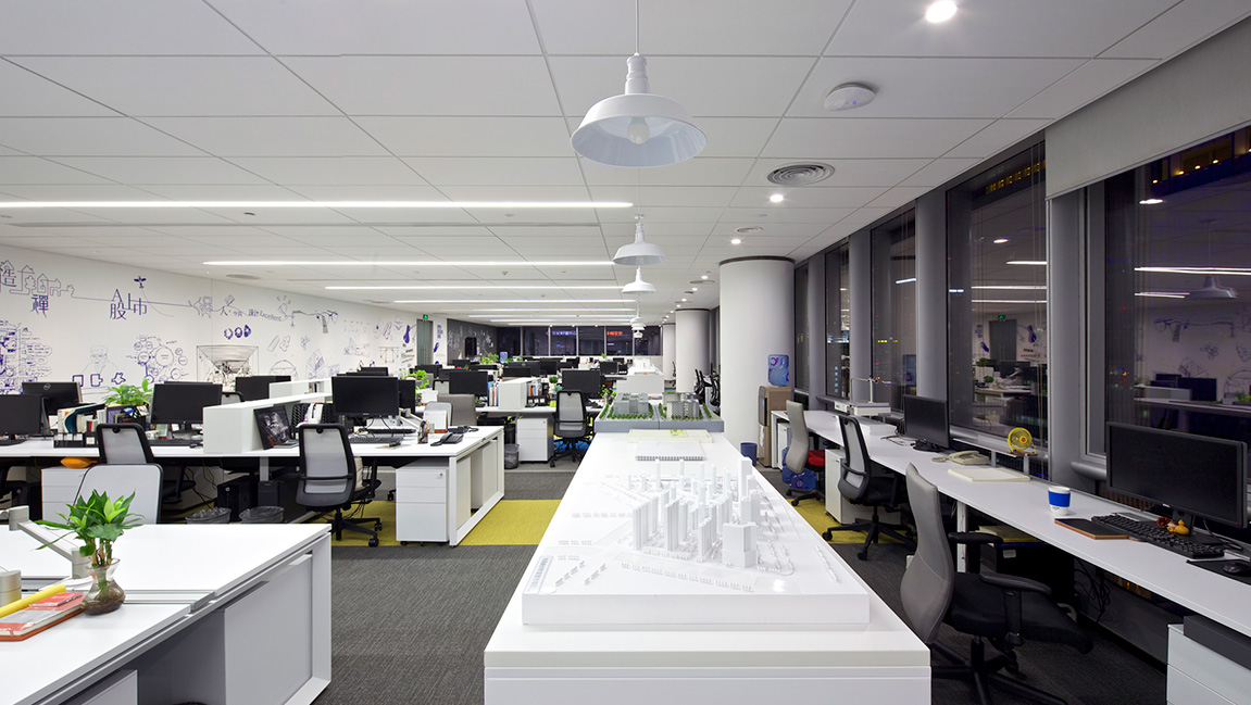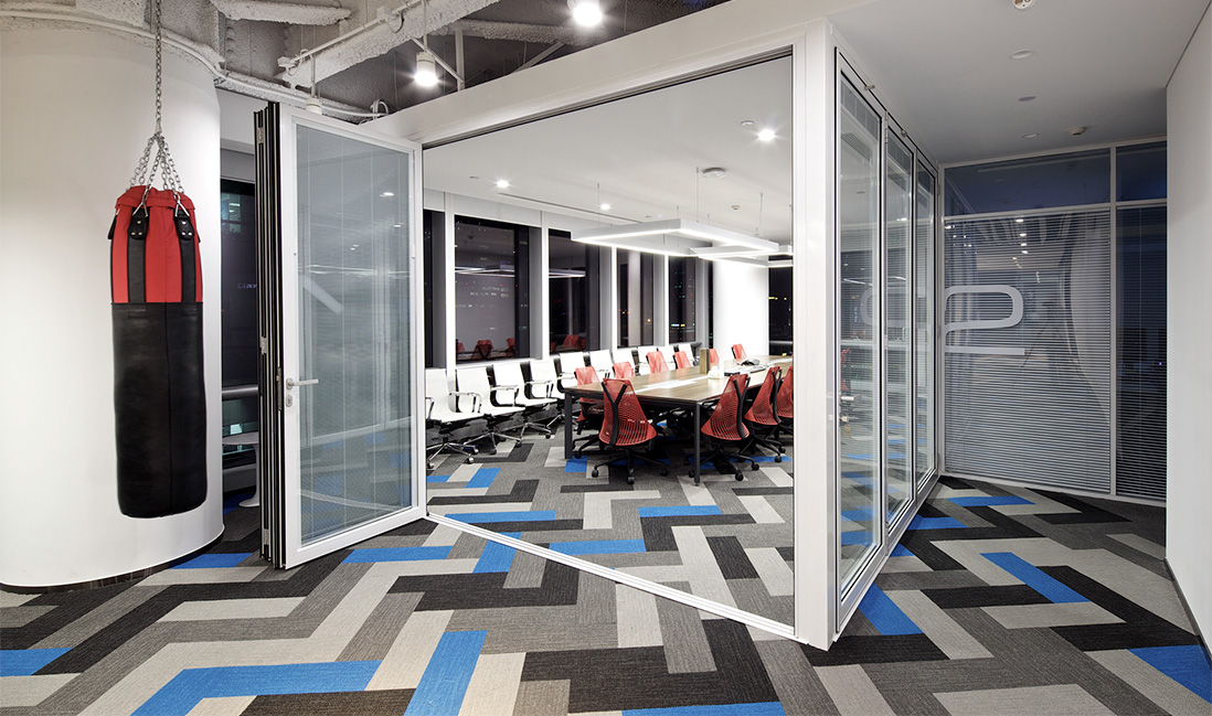 項(xiàng)目的辦公家具全部采用全球第一大辦公家具品牌Steelsace提供,地毯為全球第一大塊毯SHAW提供, 另外還使用了德國(guó)旭格的推拉門、英國(guó)索恩THORN的燈具、星牌優(yōu)時(shí)吉的礦棉板等,力求打造高效、靈活、科技、環(huán)保的辦公空間。墻面采用絲網(wǎng)印刷技術(shù), 設(shè)置拳擊沙袋區(qū),這些既體現(xiàn)了企業(yè)文化,同時(shí)也達(dá)到辦公環(huán)境與家具、地毯的渾然天成,增強(qiáng)了員工工作中的愉悅度。