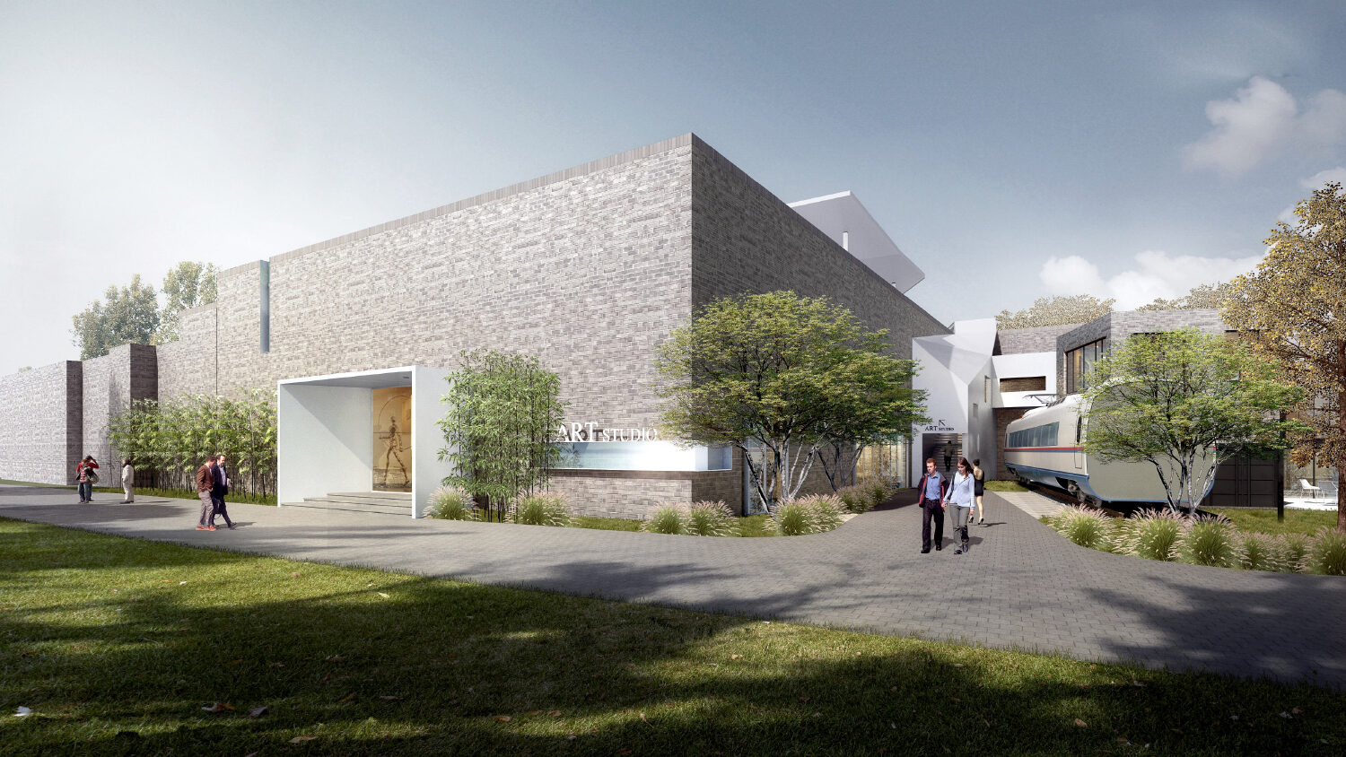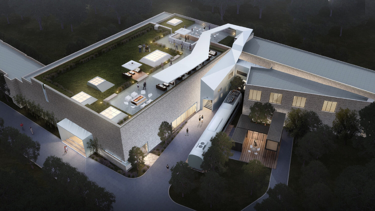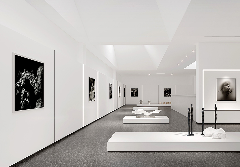 設(shè)計靈感源自現(xiàn)代主義畫作,運(yùn)用純粹幾何形體與自然光線來營造藝術(shù)氛圍。白色金屬板除嵌入主入口外,也被用作次入口雨棚并延續(xù)到屋面樓梯間及外擺區(qū),形成連續(xù)舒展的建筑形態(tài),賦予舊建筑強(qiáng)烈的標(biāo)識性和靈動感??缮先宋菝鏋閰⒂^者提供了室外活動場地和眺望森林公園的機(jī)會。另外,屋面增設(shè)了不同形狀的天窗,為室內(nèi)帶來自然采光變化,室內(nèi)功能布局也圍繞天窗展開。不同于封閉式展出方式,流動的光線讓展覽空間具有了生命力。