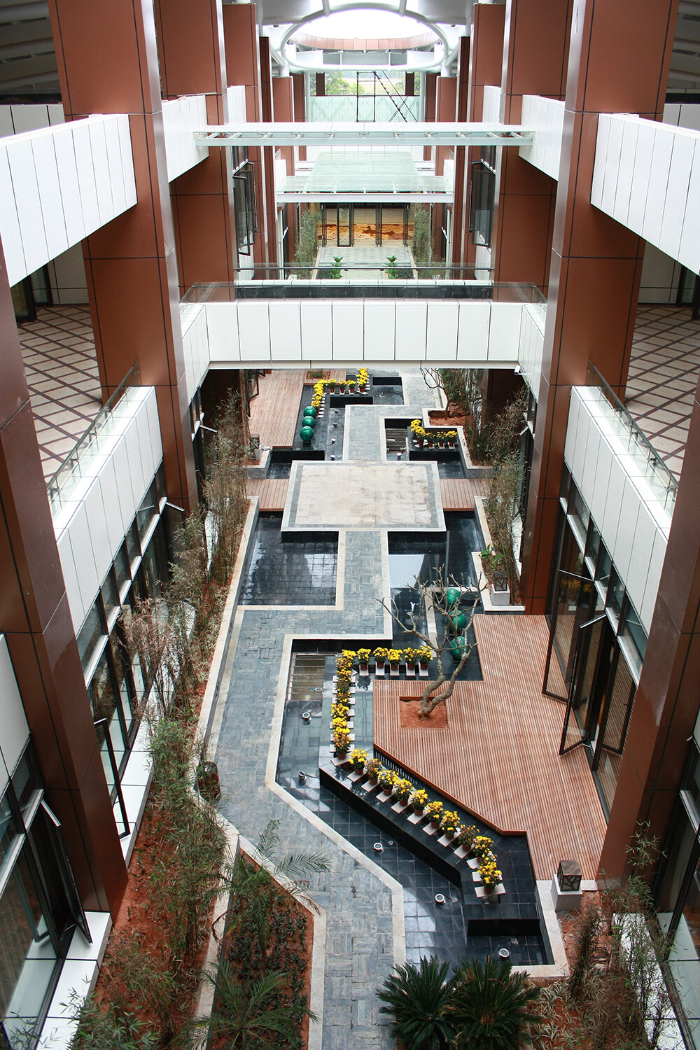 三亞鳳凰國(guó)際機(jī)場(chǎng)貴賓航站樓處于機(jī)場(chǎng)相對(duì)獨(dú)立的區(qū)域,極具動(dòng)感張力,好似海浪、帳篷般的建筑形態(tài),富有嶺南新中式風(fēng)情的室內(nèi)裝飾手法,無(wú)不彰顯貴賓航站樓的吸引力。因此,景觀營(yíng)造采取內(nèi)向型的設(shè)計(jì)方向,與建筑、室內(nèi)相輔相成,創(chuàng)造出航站樓環(huán)境與機(jī)場(chǎng)大環(huán)境相互交流、和諧共生的空間藝術(shù)。一系列的新中式園區(qū),提升了航站樓的空間品質(zhì),人們仿佛置身于寧?kù)o而舒適的中國(guó)傳統(tǒng)庭園之中。
